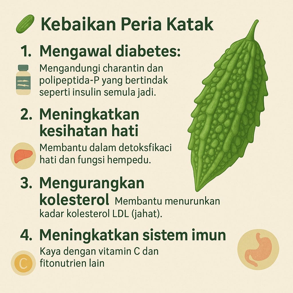 2. Bitter Gourd (Peria Katak) – Sayur Pahit Berkhasiat Kandungan utama: Charantin, polipeptida-P, vicine, Vitamin C, flavonoid. Manfaat: * Mengurangkan gula dalam darah – sangat baik untuk pesakit diabetes. * Meningkatkan fungsi hati – bantu detoksifikasi badan. * Menyokong sistem imun – kandungan Vitamin C dan antioksidan. * Baik untuk kulit – bantu masalah jerawat dan eczema. * Turunkan berat badan – rendah kalori, bantu kawal selera makan.