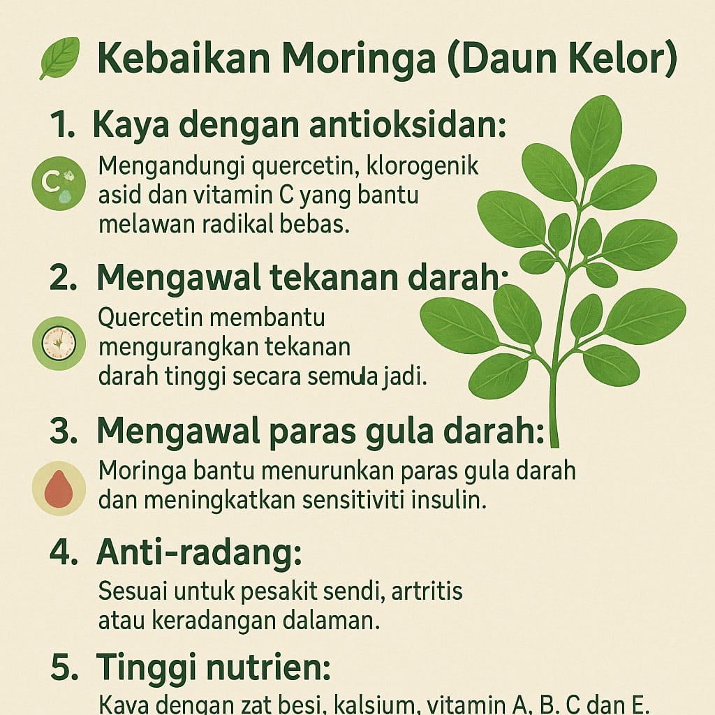 1. Moringa (Daun Kelor) – “Superfood” Semula Jadi Kandungan utama: Vitamin A, C, E, kalsium, zat besi, antioksidan, asid amino. Manfaat: * Menurunkan tekanan darah – bersifat vasodilator semula jadi. * Mengawal gula darah – bantu pesakit diabetes kawal glukosa. * Anti-radang & antioksidan – lawan radikal bebas, kurangkan risiko kanser. * Tingkat tenaga dan imun – banyak nutrien untuk sokong sistem imun dan stamina. * Menambah susu ibu – sering digunakan oleh ibu menyusu. * Menurunkan kolesterol – bantu jantung lebih sihat.