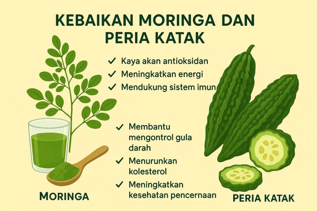Moringa Plus (biasanya gabungan daun Moringa dan bahan tambahan lain) dan peria katak (bitter gourd) kedua-duanya mempunyai banyak manfaat untuk kesihatan manusia. Berikut adalah ringkasan manfaat utama: